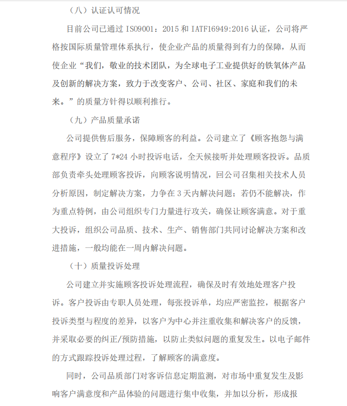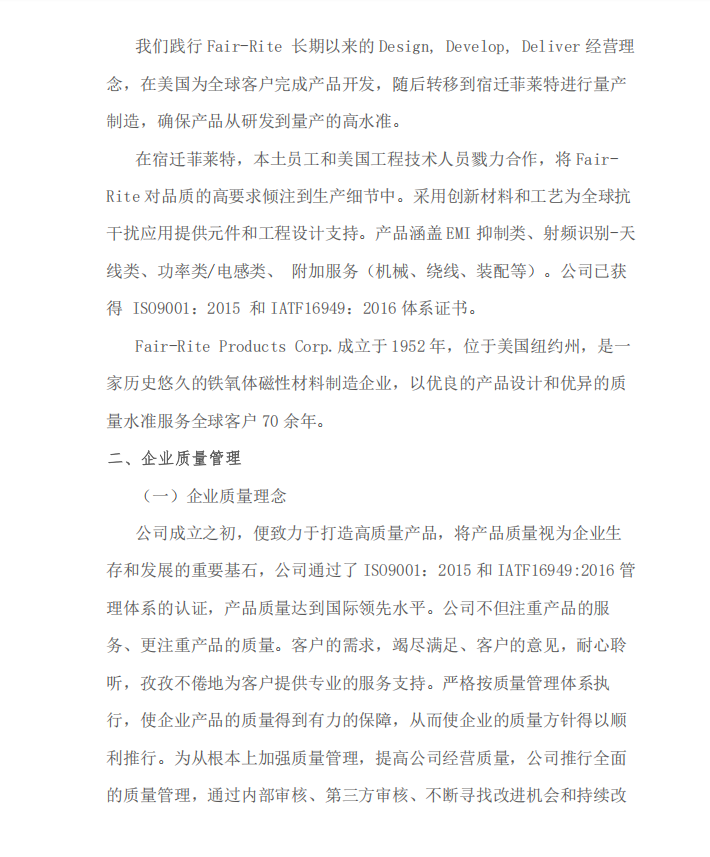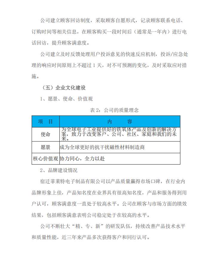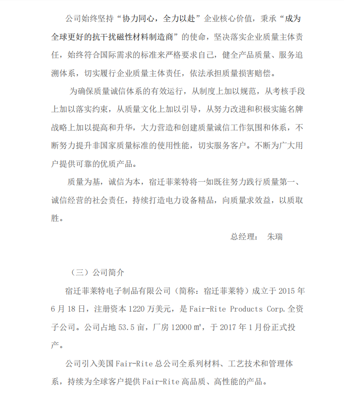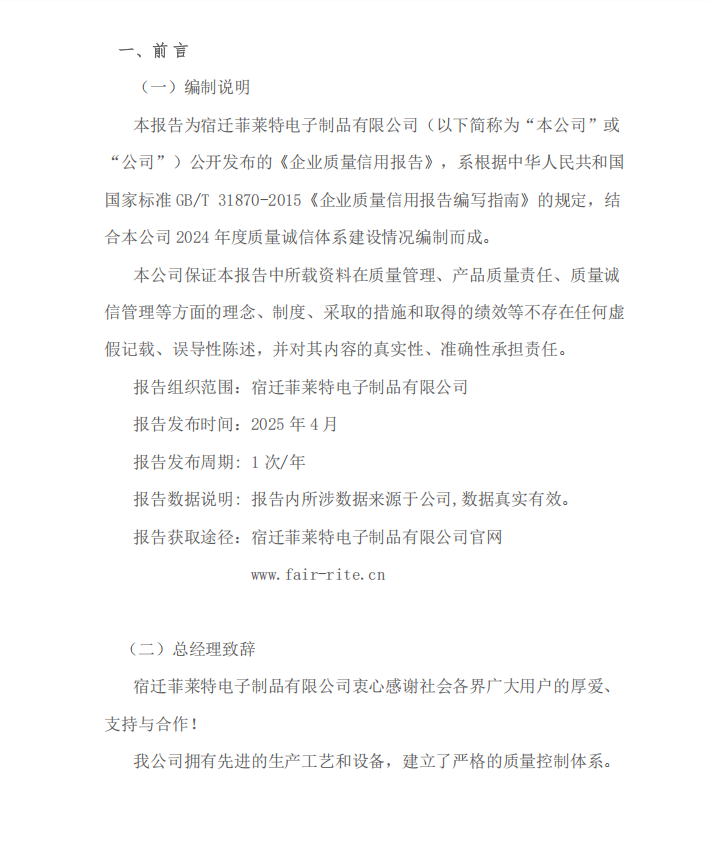 宿迁菲莱特电子制品有限公司质量诚信报告